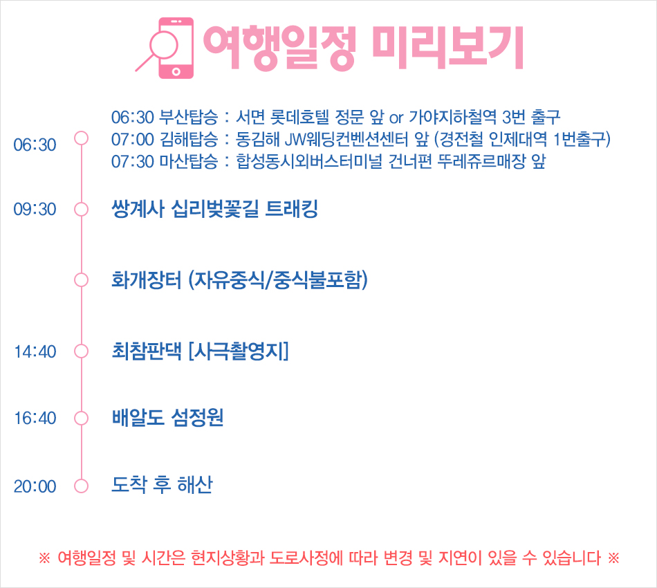 ※ 본 상품은 지자체에서 지원을 받아 특가로 운영되는 상품으로 지역방문 사실확인을 위해 단체사진 촬영 및 자유중식 후 식사 영수증을 가이드에게 제출해주세요. (지자체 제출용으로 확인 후 폐기처리됩니다.)